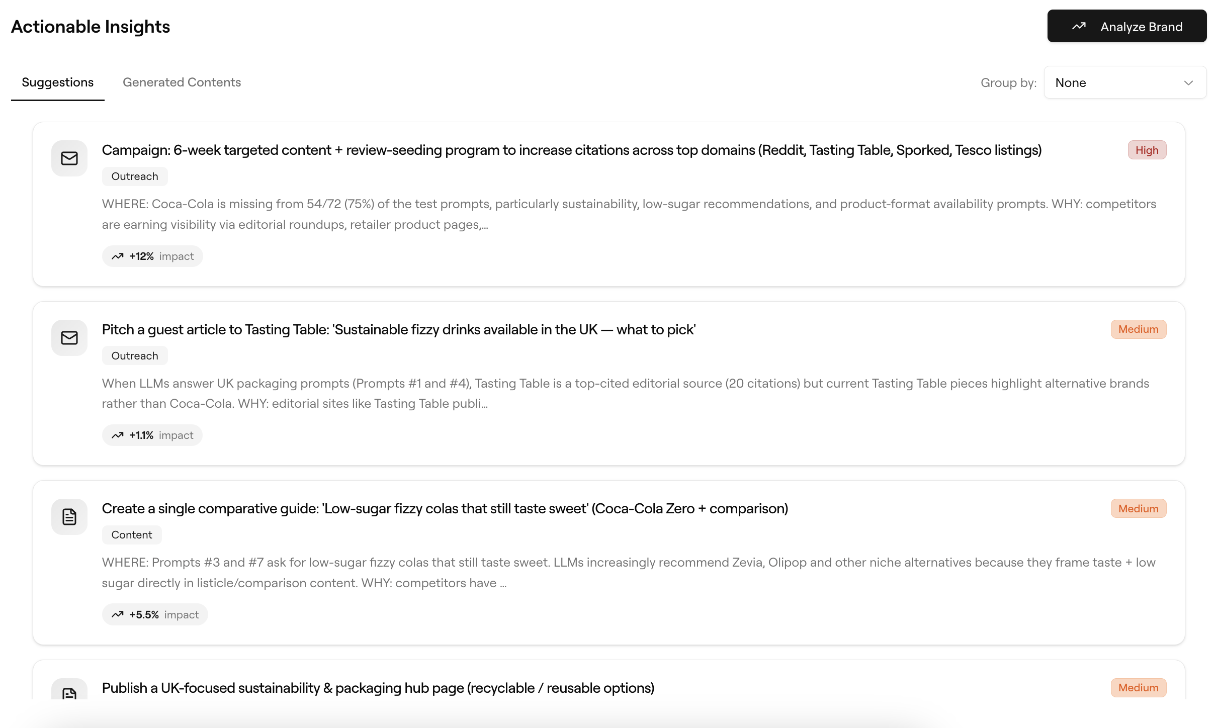 Turn insights into instant content and generate high-impact, prompt-optimized copy based on what AI prefers — no agency needed.