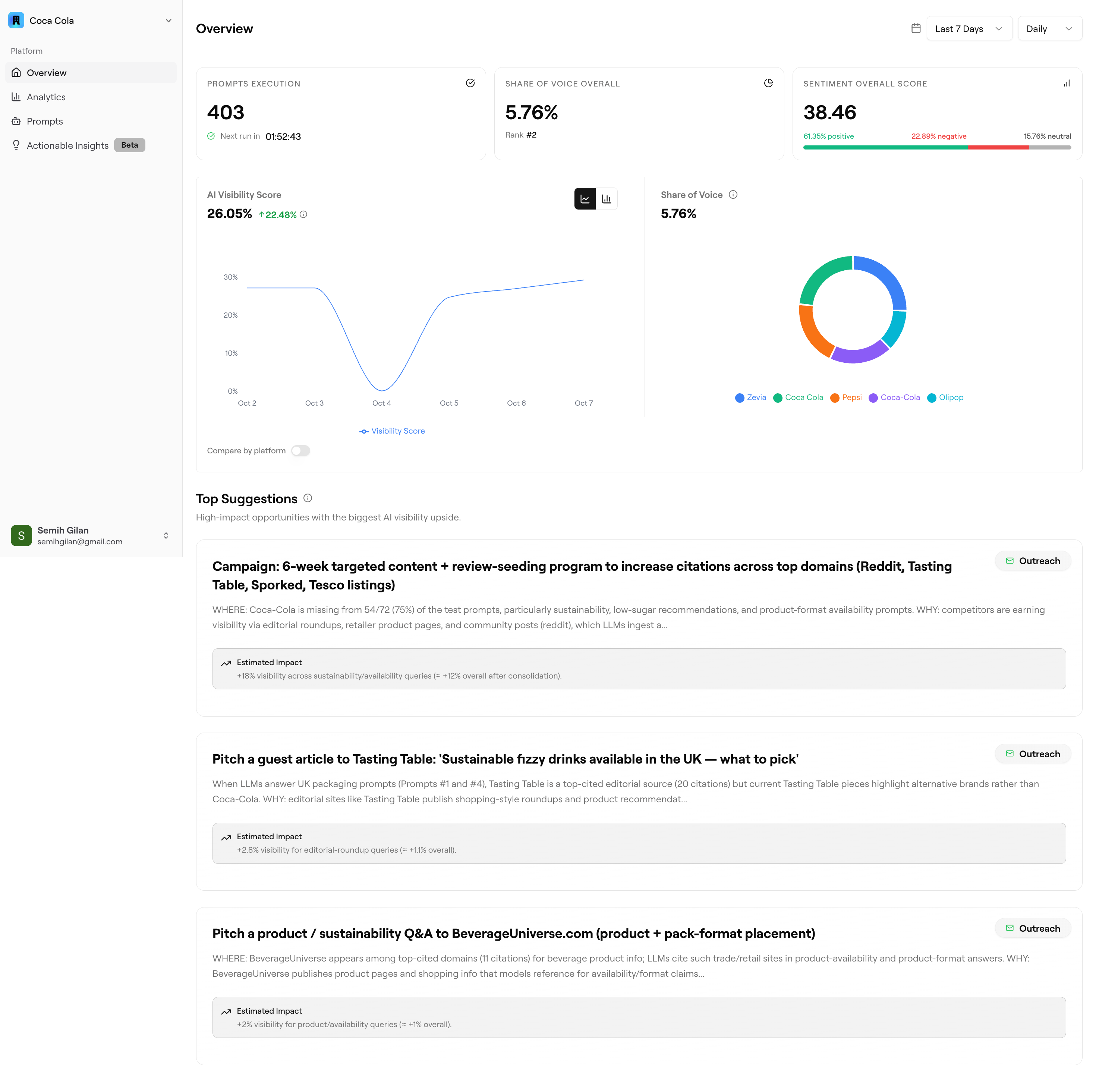 Turn insights into impact. Receive actionable recommendations to improve positioning and seize trending prompts.
