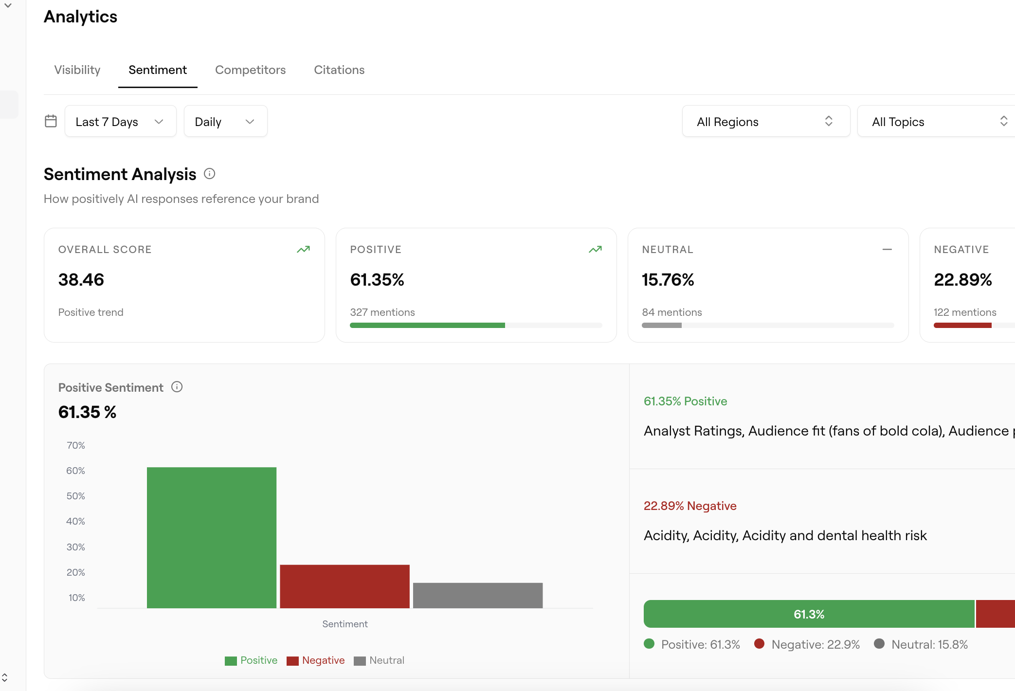 See what AI says — and why. Track brand mentions, sentiment, and context across AI answers, summaries, and chats.