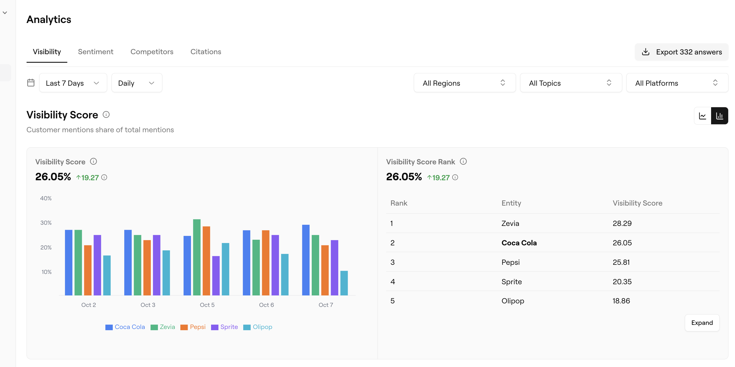 Benchmark Competitor Performance and compare visibility, sentiment, share of voice and ranking position across rival brands.